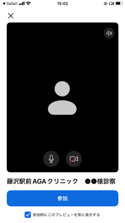 ミーティング画面が開くので「参加」を選択し、オンライン診察を開始します。